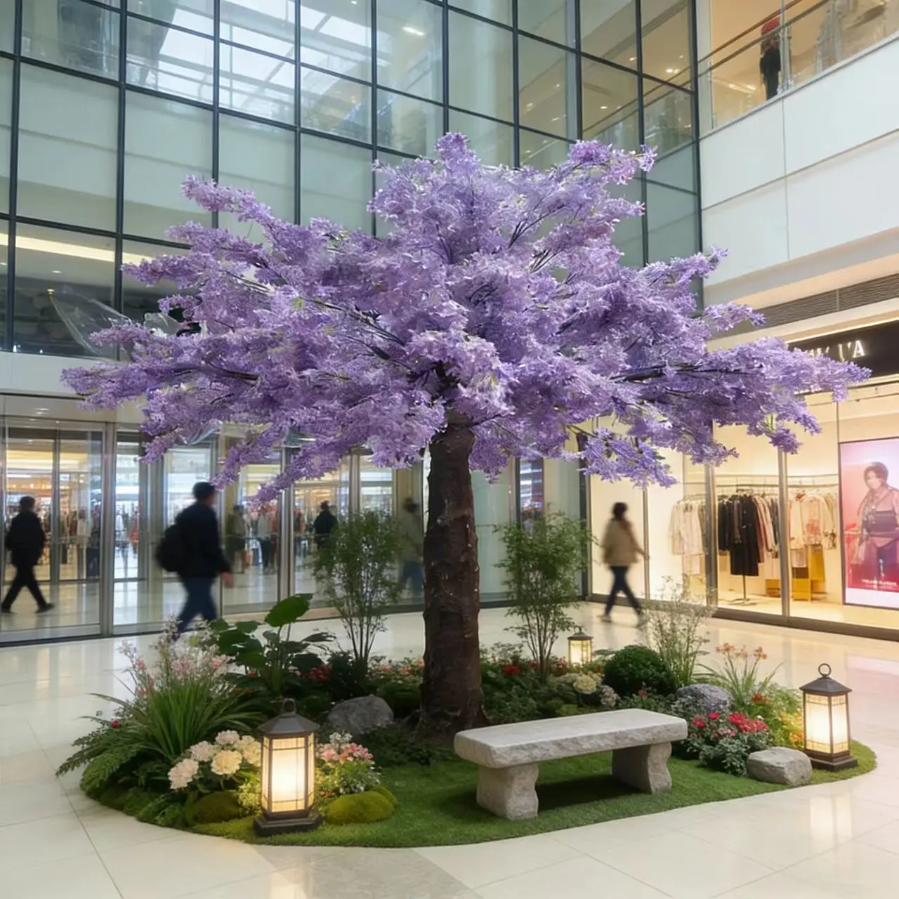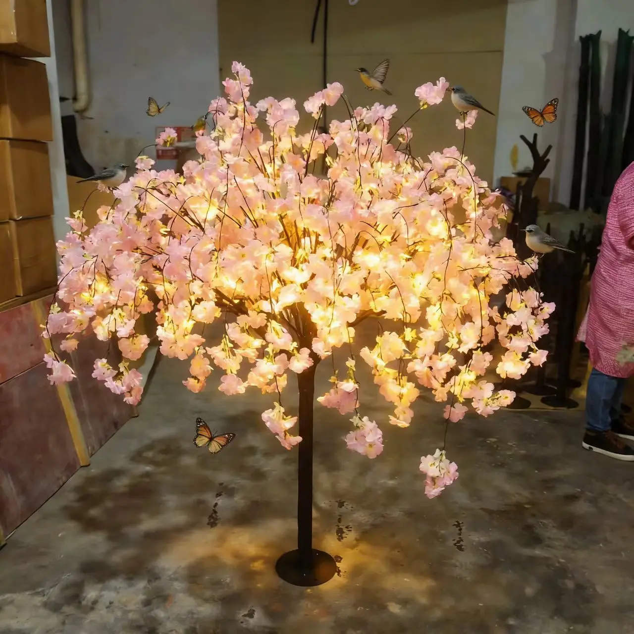 Silk petals & fiberglass trunk, durable and easy to maintain; with LED lights, bird & butterfly ornaments, full of atmosphere;